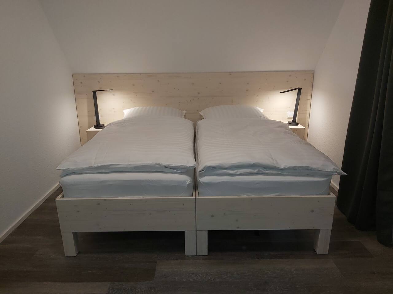 Im Obergeschoss liegt das schöne Schlafzimmer. Hier können die Betten als Doppelbett oder als Einzelbetten verwendet werden. 2 bequeme Stühle mit passendem Tischchen laden zum Lesen ein.