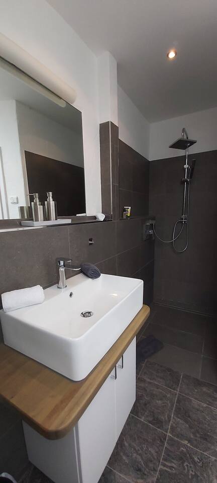Direkt ensuite befindet sich das schicke Badezimmer mit Tageslicht, großzügiger Dusche, WC, Waschbecken und großem Wandspiegel. Ein Fön liegt im Waschbeckenunterschrank zur Benutzung bereit.